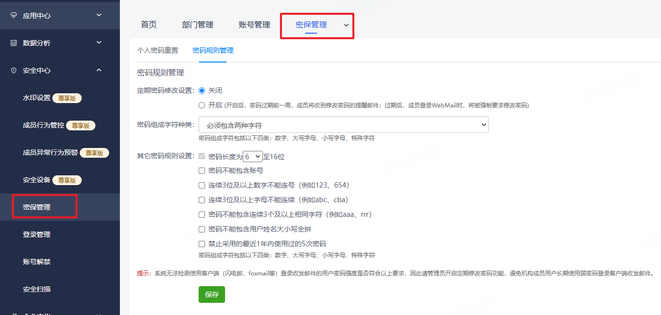 推荐企业管理员设置以下复杂的密码规则,避免员工使用简单密码;开启定期修改密码设置,开启后,密码过期前一周,成员将收到修改密码的提醒邮件;过期后,成员登录WebMail时,将被强制要求修改密码,针对长期不登录的账号也能起到防护作用。