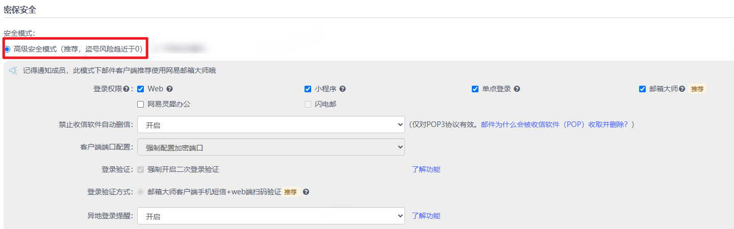 登录验证方式:推荐邮箱大师客户端手机短信+web端扫码验证;同时强制开启二次登录验证