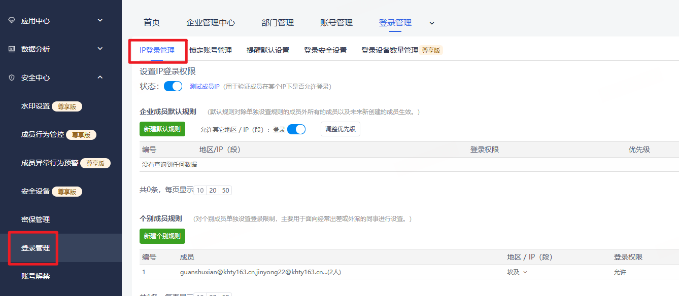 设置登录ip权限,通过“新建默认规则”,来限制全体成员可访问邮箱的IP范围,也可以通过“新建个别规则”,来限制个别成员可访问邮箱的IP范围。