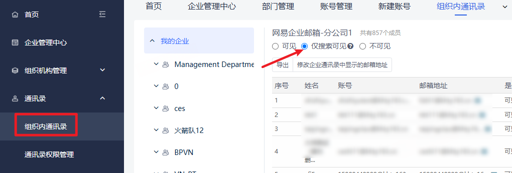 推荐管理员设置企业通讯录的使用方式为【仅支持员工对企业通讯录进行搜索】无法查看完整的企业通讯录,避免公司的组织架构被泄露